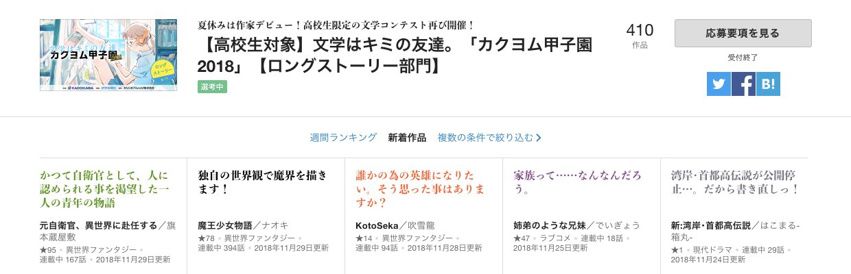 Web小説サイト カクヨム 運営 コンテスト改善1 コンテストに参加した小説が数多く露出するよう コンテストページをリニューアルしました 主な変更点 トップ露出作品数増加4件 12件 新着作品ページ追加 コンテスト検索機能追加 コンテスト